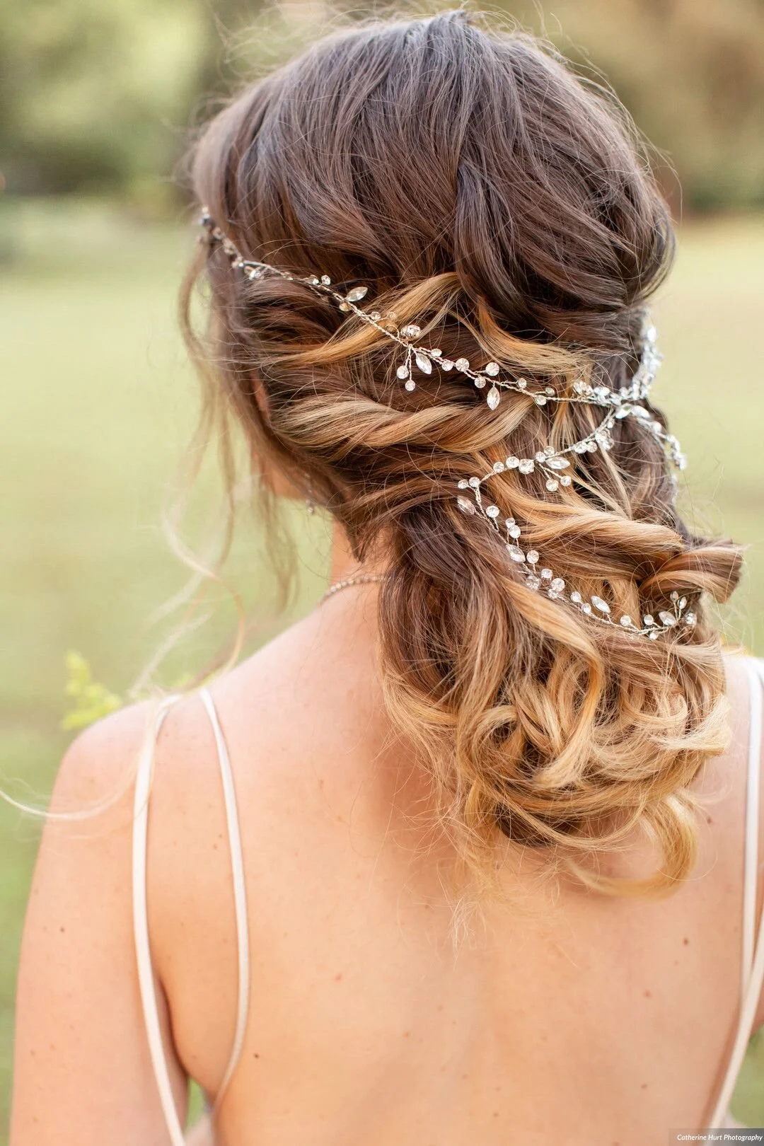Most likely, you’ll have some other type(s) of accessories in addition to what you’d like in your hair, so generally speaking, it’s a good rule of thumb to keep things on the simpler side. Now, this isn’t to say that you can’t go for those GORGEOUS accessories that boast different beautiful jewels, but if that’s what you have in mind, you may want to think about the other aspects included. It’s also a good idea to take your veil into consideration. If you’re going to be wearing a veil, you’ll want to think about how having your chosen accessory with your veil may affect placement. All in all, it’s a great conversation to have with your stylist, and even better to bring along for your Bridal Trial to figure things out ahead of time!